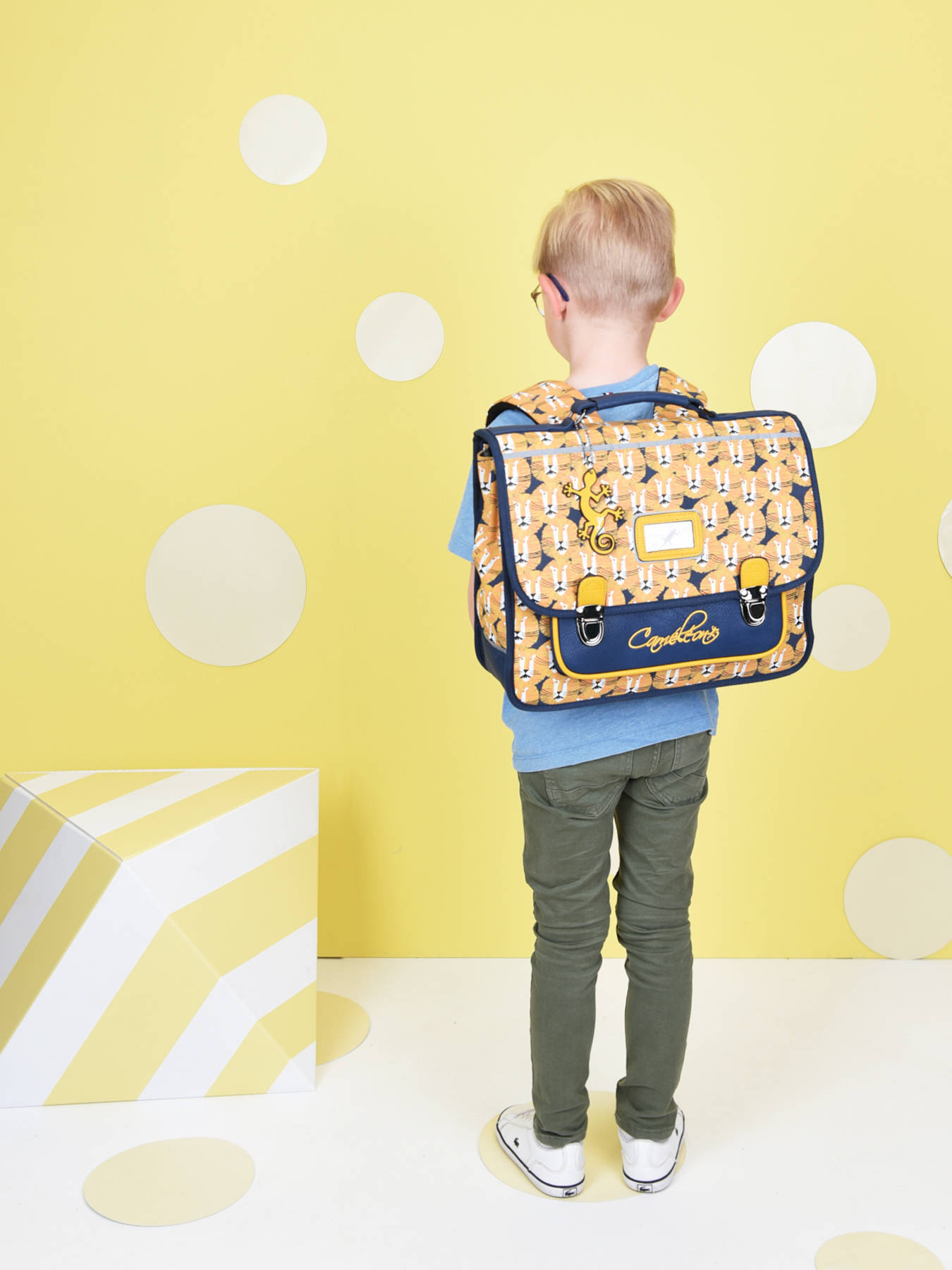 35 cm - 13 litres - 0.89 kg ~ Cartable enfant 35cm de la ligne Retro signé Caméléon, idéal pour la maternelle ou le CP. Ce cartable enfant se divise en 2 compartiments pouvant contenir les formats cahiers 21x29,7 cm et 24x32 cm. On retrouve à l'intérieur du cartable enfant un emplacement spécial règle et une poche zippée centrale. La poche avant simple est parfaite pour y glisser le goûter. Conçu pour le confort des enfants, le dos et les bretelles de ce cartable 35cm sont renforcés. Fabriqué à partir de polyester recyclé imperméable. Enfin, côté sécurité, des bandes réfléchissantes sont prévues autour du sac. Petit plus, un emplacement pour la gourde est situé sur le côté du cartable. Une règle est offerte dans ce cartable !