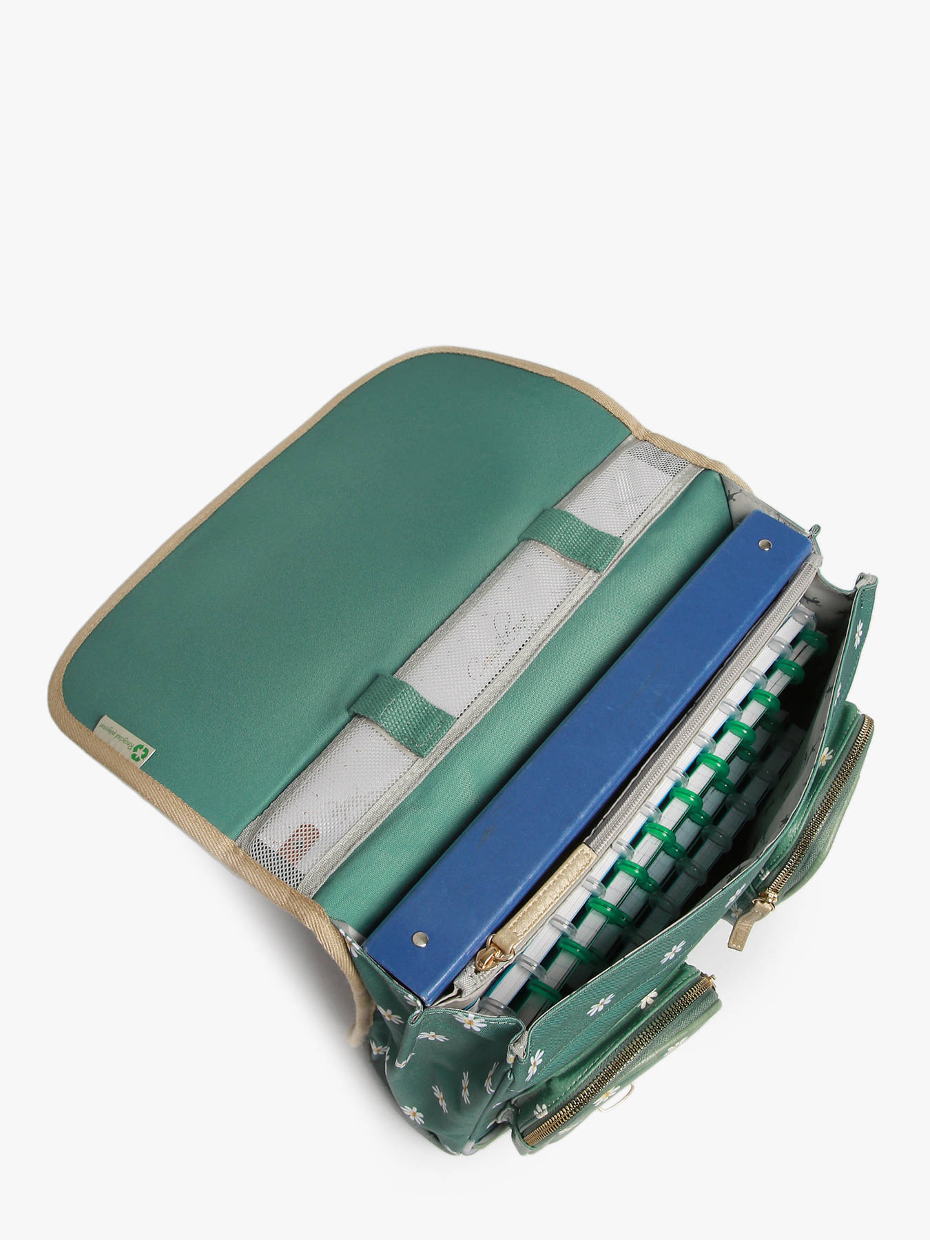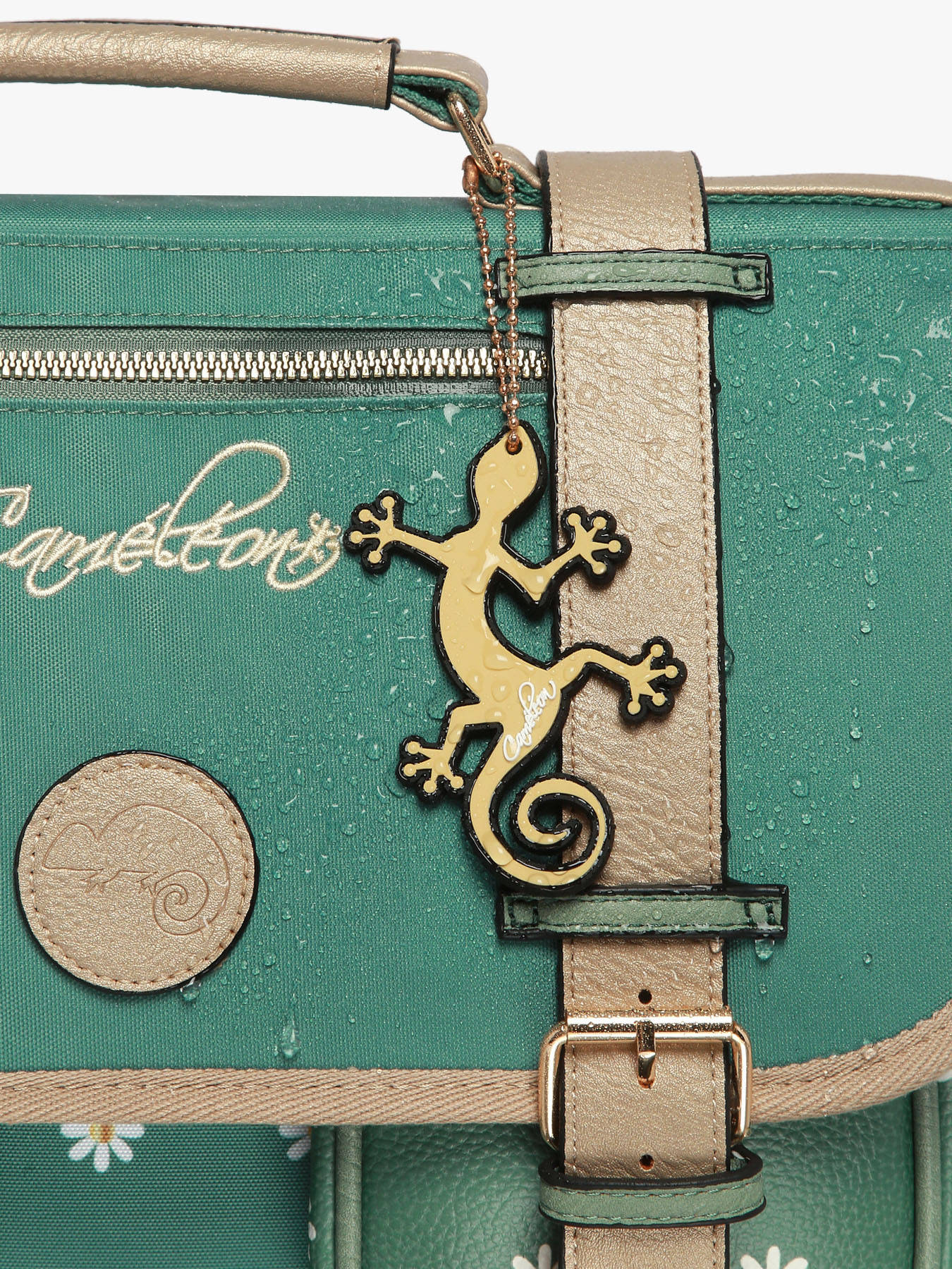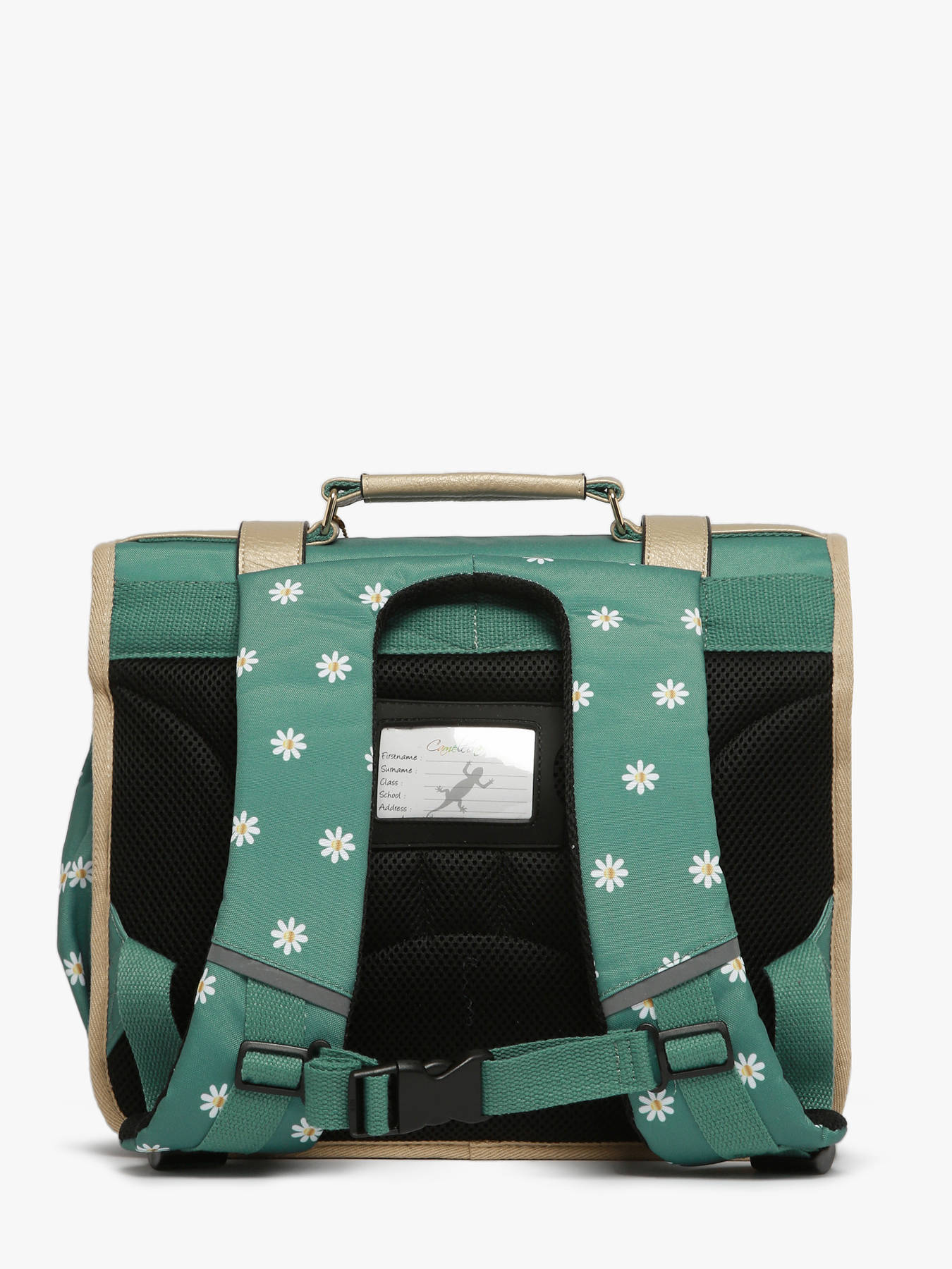 35 cm - 12 litres - 1 kg ~ Cartable enfant 35cm de la ligne Vintage Fantasy signé Caméléon, parfait pour la maternelle et le CP ! Fabriqué en polyester recyclé imperméable. Ce cartable 35cm dispose de deux compartiments pour les cahiers formats 21x29,7 et 24x32cm ainsi qu'une poche zippée, un emplacement spécial règle et un emplacement pour gourde. Il se ferme à l'aide d'un rabat et de deux fermoirs, et possède deux petites poches à fermeture éclair sur le devant, pratique pour le goûter. Le cartable dispose d'une étiquette nom. Très confortable, le dos, les bretelles et le fond sont renforcés. Côté sécurité, des bandes réfléchissantes sont disposées autour du sac. Petit plus, la règle est offerte avec le cartable Caméléon !