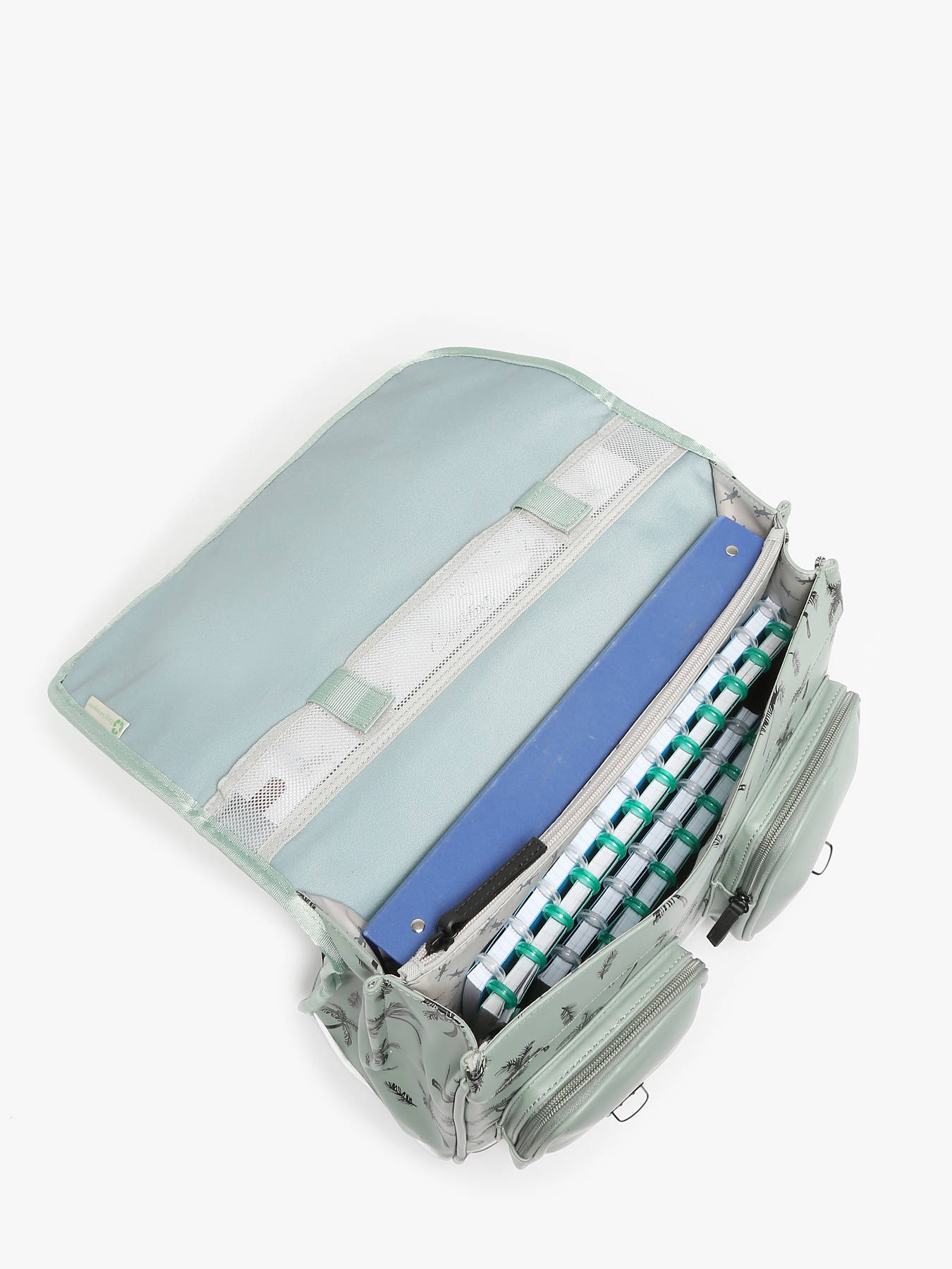 38 cm - 18 litres - 1.5 kg ~ Cartable primaire 38 cm signé Caméléon de la ligne Vintage North. Ce cartable enfant convient parfaitement pour le CP, le CE1 et le CE2. On adore les belles touches vintage avec ses finitions et sa poche à fermeture zippée sur le rabat ! Il se divise en deux grands compartiments pour l'ensemble des affaires d'école. Fonctionnel, il dispose d'une poche intérieure zippée, d'un emplacement spécial règle ainsi que de deux poches à fermeture éclair sur le devant du cartable. Petit plus, ce cartable dispose d'une étiquette nom et d'un emplacement pour la gourde sur le côté. Ergonomique, la poignée et le fond du cartable sont renforcés. Très confortable, le dos et les bretelles sont rembourrés. Ce cartable est imperméabilisé. Côté sécurité, des bandes réfléchissantes sont disposées autour du cartable enfant. Petit plus, une règle est offerte !