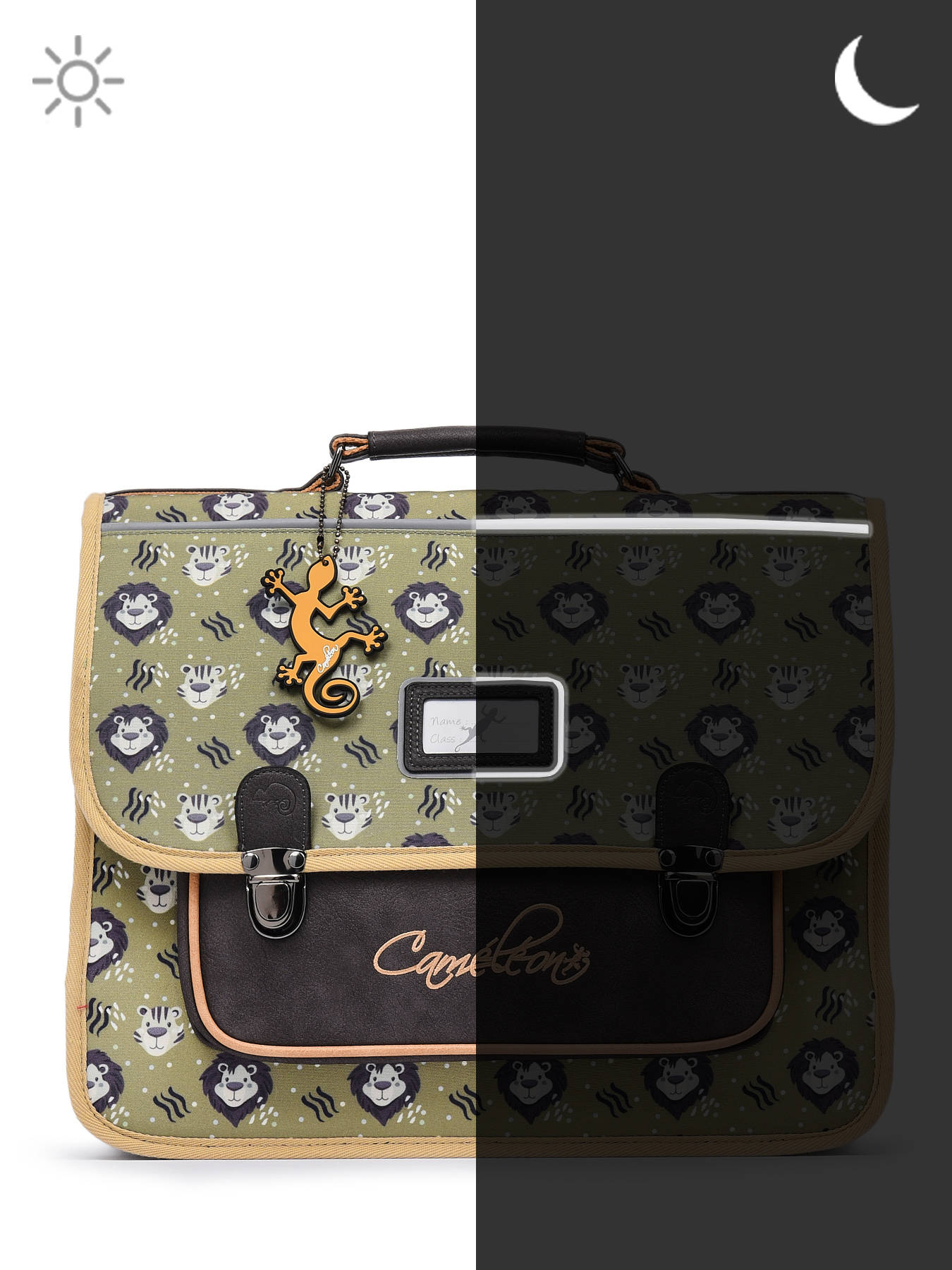 38 cm - 13 litres - 1.12 kg ~ Cartable enfant primaire 38 cm de la ligne Rétro signé Caméléon, idéal pour le CP, CE1 et CE2. Ce cartable enfant se divise en deux compartiments pouvant contenir des cahiers format A4. On retrouve à l'intérieur du cartable enfant une poche centrale zippée. La poche avant de ce cartable est parfaite pour y glisser le goûter. Sur le côté extérieur du sac, se trouve un emplacement pour y glisser une gourde. Conçu pour le confort des enfants, le dos et les bretelles sont renforcés . Fabriqué à partir de polyester recyclé imperméable. Enfin, côté sécurité, des bandes réfléchissantes sont prévues autour du sac. Une règle est offerte à l'intérieur du cartable caméléon !