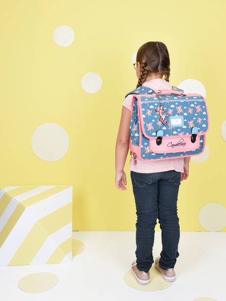 35 cm - 13 liters - 1.1 kg ~ 35cm children's satchel from the Retro line by Caméléon, ideal for kindergarten or first grade. This children's satchel is divided into 2 compartments that can hold the 21x29.7 cm and 24x32 cm notebooks formats. Inside the children's satchel, there is a small zipped pocket, a special ruler location and an elastic for the water bottle. The front pocket is perfect for snacks. Designed for children's comfort, the back and shoulder straps of this 35cm schoolbag are reinforced. Made from waterproof recycled polyester. Finally, on the security side, reflective bands are provided around the bag. A ruler is offered in this binder!
