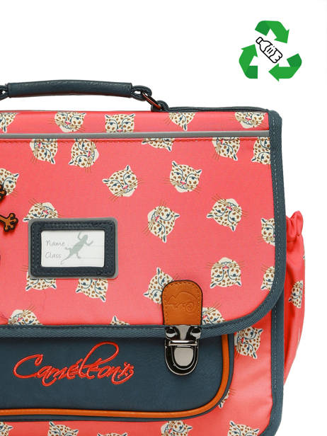 38 cm - 13 liters - 1.12 kg ~ Primary school bag 38 cm from the Retro line signed Caméléon, ideal for the first grade, grade three and grade three. This children's schoolbag is divided into two compartments that can hold A4 size notebooks. Inside the children's satchel there is a small zipped pocket, a special ruler location and an elastic to slip a water bottle. The front pocket of this satchel is perfect for snacks. Designed for children's comfort, the back and shoulder straps are reinforced. Made from waterproof recycled polyester. Finally, on the security side, reflective bands are provided around the bag. A ruler is offered inside the chameleon binder!