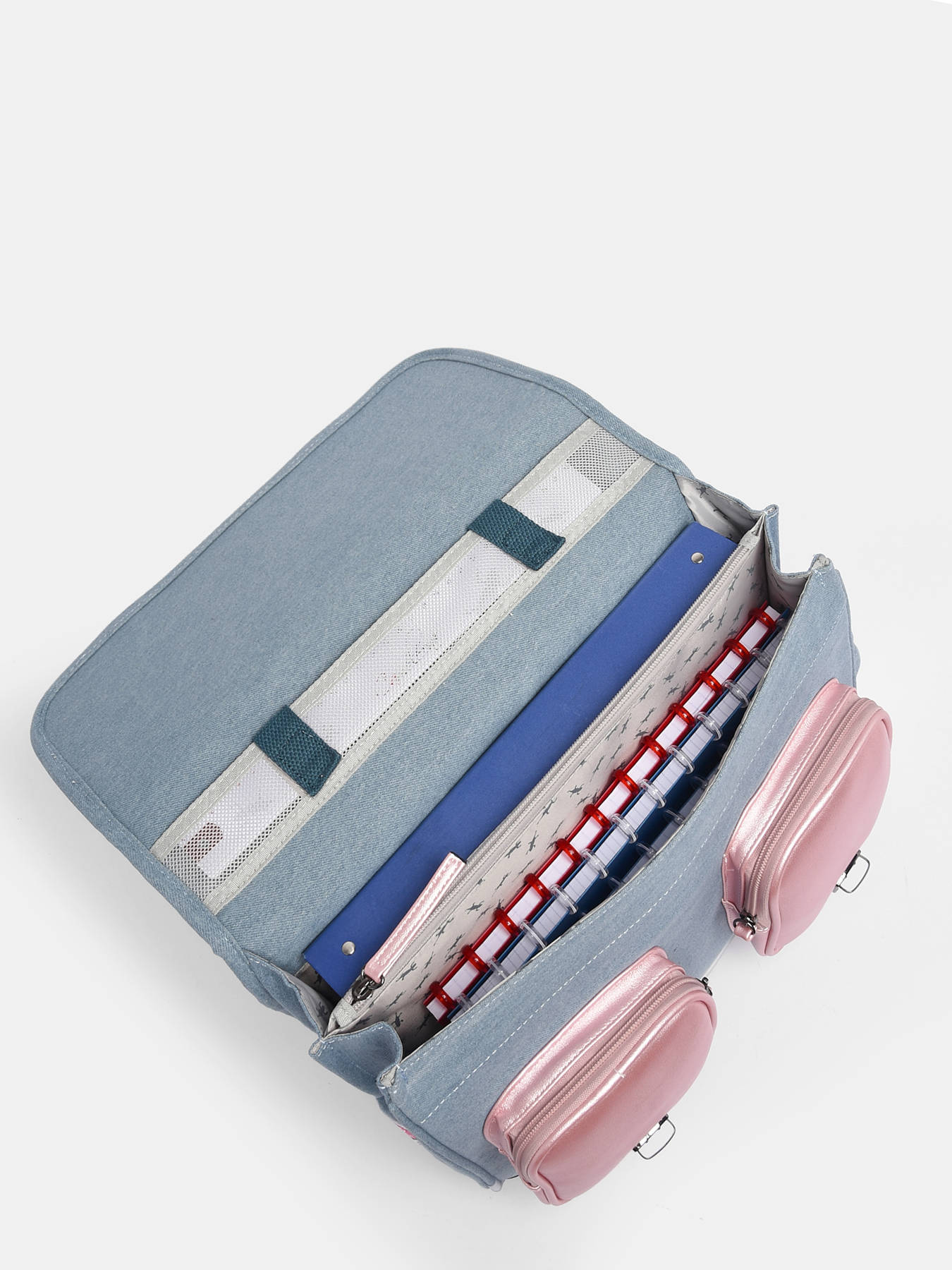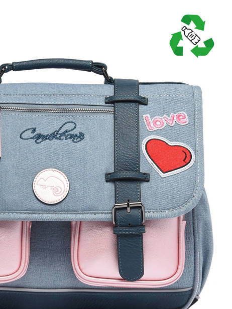 38 cm - 18 liters - 1.07 kg ~ 15-inch Satchel from the brand Cameleon, Vintage Fantasy collection. Perfect for primary school, it is divided in two parts where you can put different documents and has a little zipped pocket. Very useful thanks to its two front zipped pockets -which can hold a snack for example ; and its nametag on the back. The bottom of the satchel is reinforced to improve its resistance and reflective straps have been placed all around on the bag.